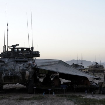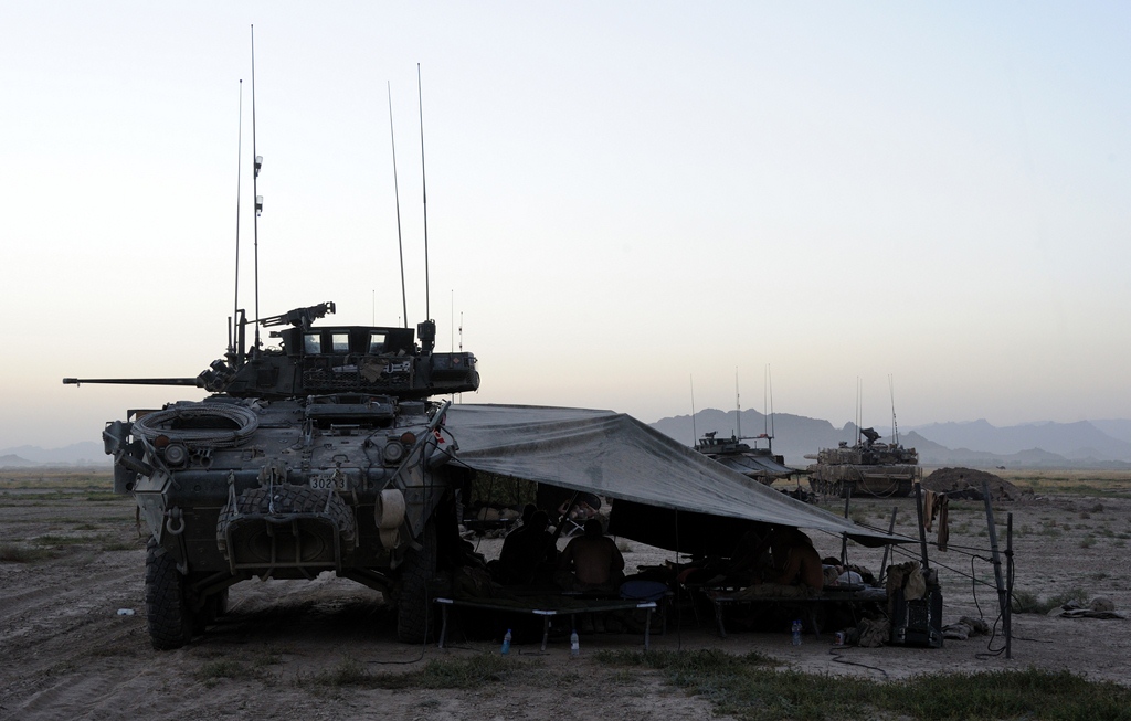 A Light Armoured Vehicle (LAV III) is used to form a leaguer which provides cover and security as Canadian Forces soldiers sleep before another day of patrolling in Panjwaâi District to clear several small villages and compounds.