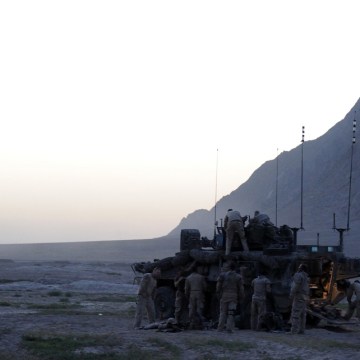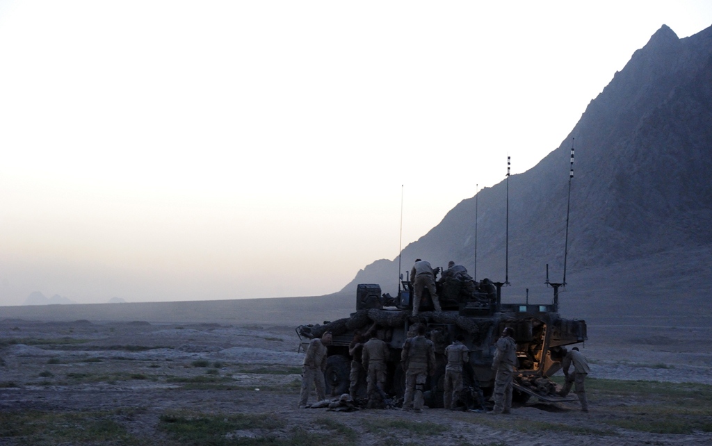 Before setting out on another day of patrolling in Panjwaâi District to clear several small villages and compounds, Canadian Forces Soldiers pack their gear into a Light Armoured Vehicle (LAV III).