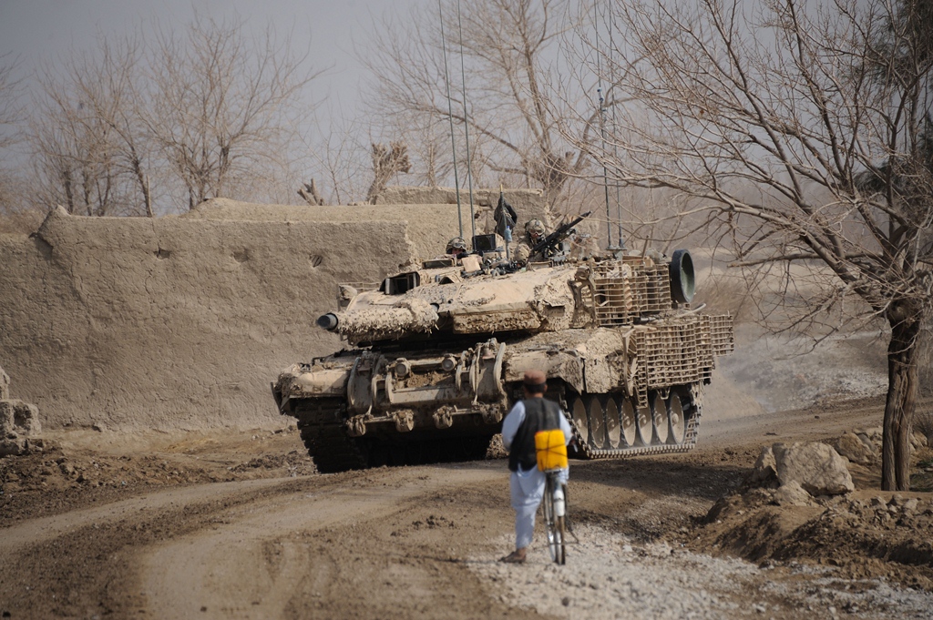 Members of 12e Régiment Blindé Canada (12 RBC) patrol along Route Hyena with Leopard C2 Tanks, providing security for locals, members of the Afghan National Security Forces (ANSF), and soldiers from the International Security Assistance Force (ISAF) during road construction.