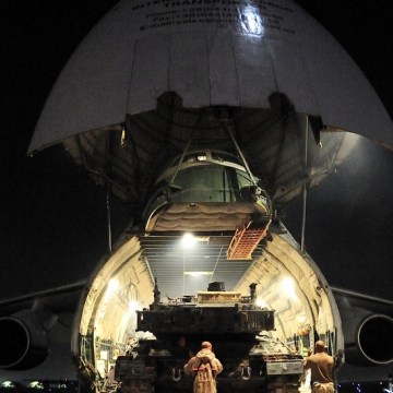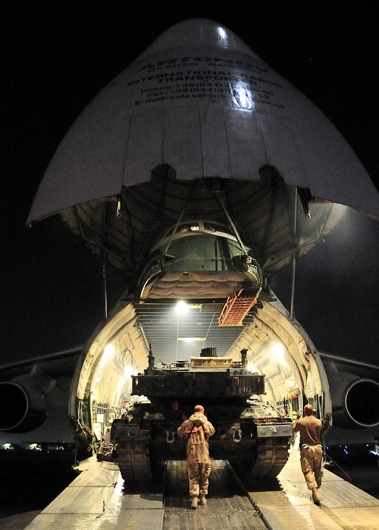 Two technicians from the Mission Transition Task Force â Mission Closure Unit directs a German Leopard C2 Main Battle Tank onto an ANTINOV aircraft that will take it back to Germany for refitting and maintenance from Kandahar, Afghanistan on 14 October 2011.