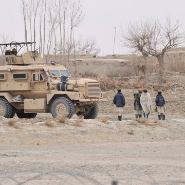 Des enfants Afghans et un Cougar, vhicule des Forces canadiennes, prs de l’installation avance de Sperwan Ghar.