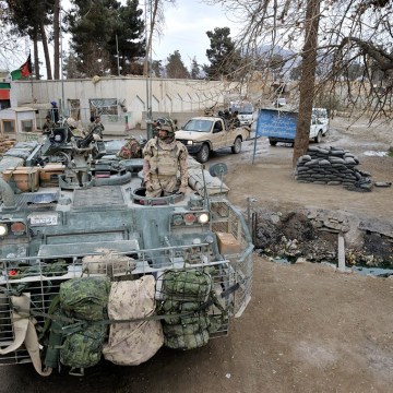 Un vhicule blind lger chenill (VBLC) de l’quipe de liaison et de mentorat oprationnel (ELMO) arrte un poste de contrle de la circulation de l’Arme nationale afghane (ANA) .