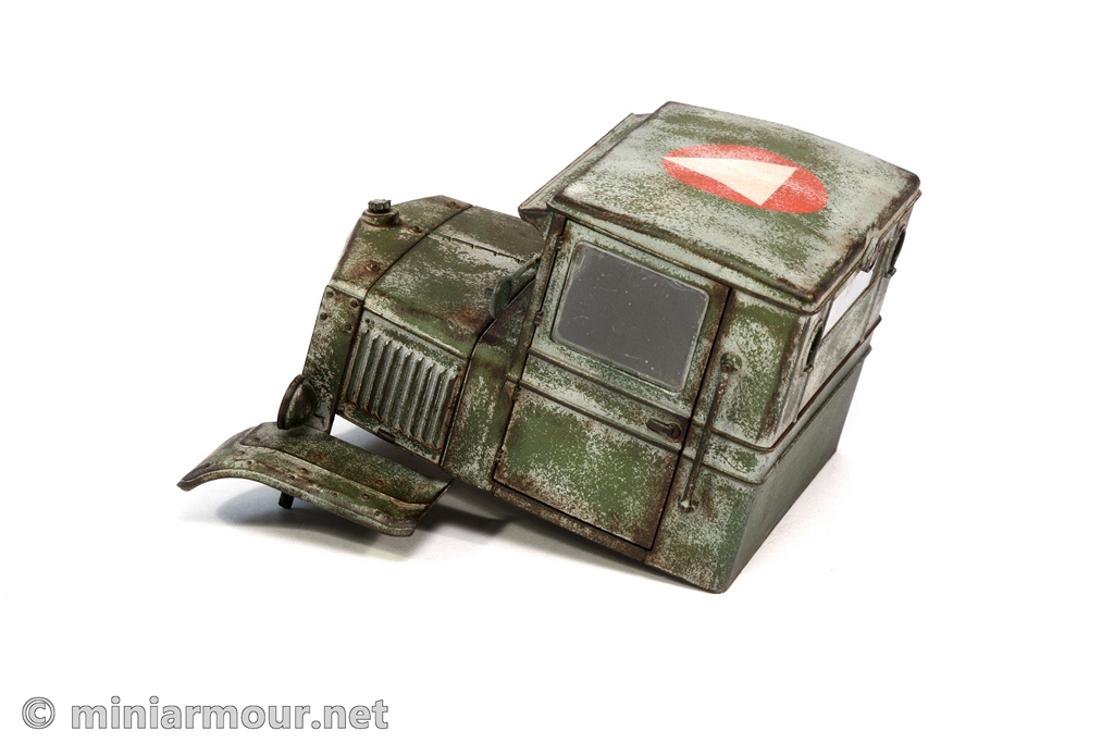 After the application of the whitewash camouflage using the hairspray method, the finish of the tractor was rather flat. The finish at this time is also rather inconsistent – there is a layer of heavily weathered and chipped white paint, apparently resulting from long period of exposure to the elements, but there is no other sign of “wear and tear” resulting from this exposure. The chipped white paint is also too clean given the prolonged time it must have taken to weather the camouflage paint.