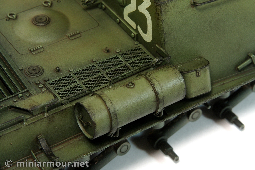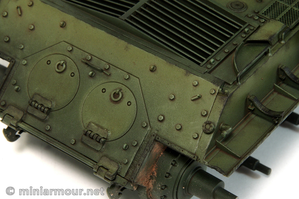I wanted to make the chips rather heavy (but still realistic) as the depicted vehicle is supposed to have been used for quite a while. Chips added quite a bit of contrast to the model, achieving the above goal. This contrast will likely be reduced slightly by the subsequent weathering steps, so I might need to retouch it again later on.
